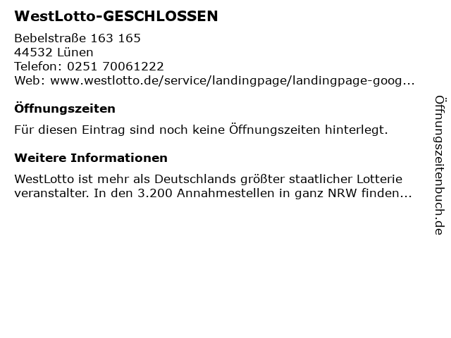 | Telefonnummer WestLotto-GESCHLOSSEN in Lünen (0251 70061222) anrufen | |