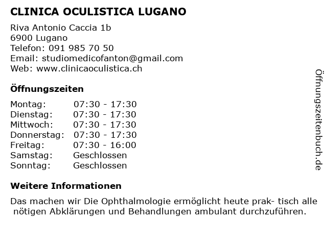 | Öffnungszeiten CLINICA OCULISTICA LUGANO in Lugano anzeigen | |