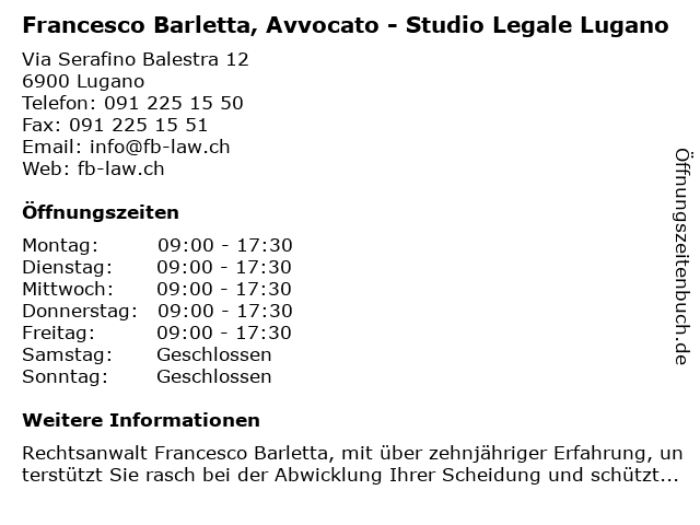 Branchen & Suchbegriffe zu Francesco Barletta, Avvocato - Studio Legale Lugano:anwälte für erbrecht – nachlassplanung, avvocato, barletta, francesco, generalanwälte, legale, lugano, mediation und schlichtung, scheidungsberatung, spezialisierte rechtshilfe, studio |