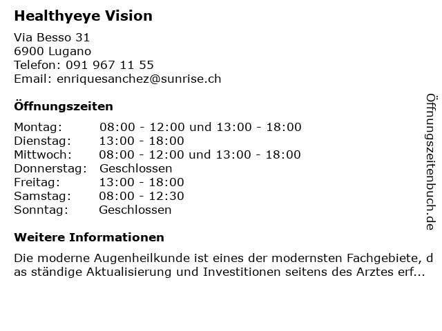 | Öffnungszeiten Healthyeye Vision in Lugano anzeigen | |