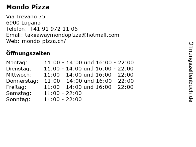 | Öffnungszeiten Mondo Pizza in Lugano anzeigen | |