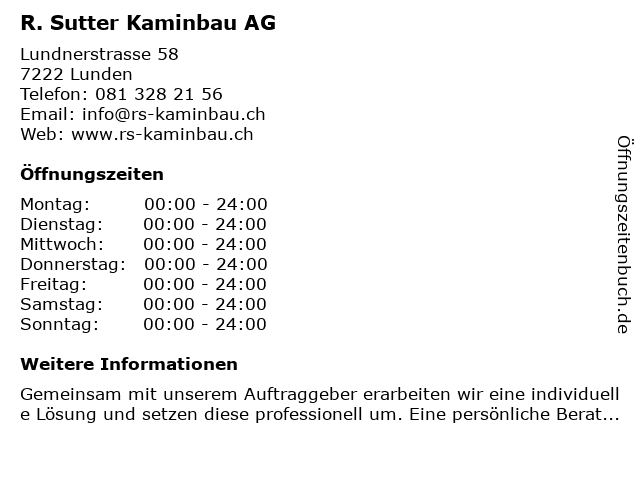 | Öffnungszeiten R. Sutter Kaminbau AG in Lunden anzeigen | |
