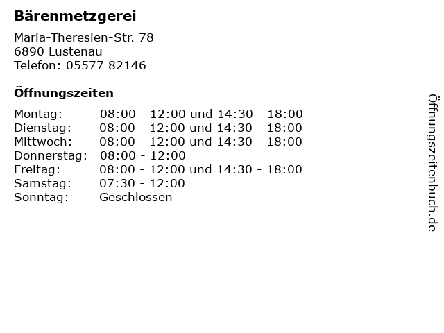 | Öffnungszeiten Bärenmetzgerei in Lustenau anzeigen | |