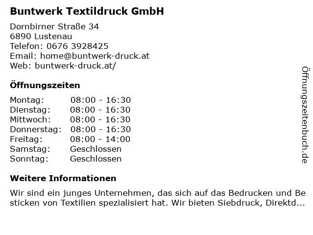 | Öffnungszeiten Buntwerk Textildruck GmbH in Lustenau anzeigen | |