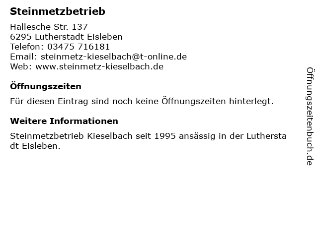 1 5 Alexander Kühn Steinmetzbetrieb am Gertraudenfriedhof (Entfernung: 28,75 km) Leibnizstr. 12, 06118 Halle 6 Thomas Francke Steinmetzbetrieb (Entfernung: 33,16 km) Rasenrain 2, 06567 Bad Frankenhausen/Kyffhäuser |