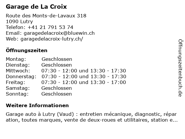 | Öffnungszeiten Garage de La Croix in Lutry anzeigen | |
