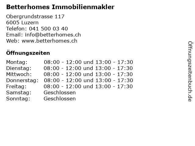 | Öffnungszeiten Betterhomes Immobilienmakler in Luzern anzeigen | |