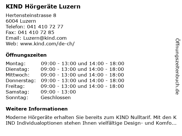 | Öffnungszeiten KIND Hörgeräte Luzern in Luzern anzeigen | |