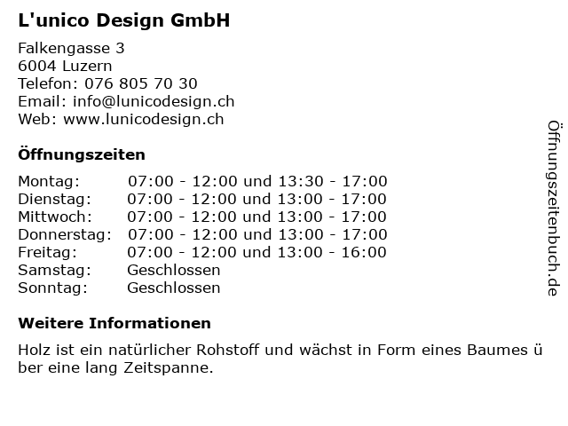 | Öffnungszeiten L'unico Design GmbH in Luzern anzeigen | |