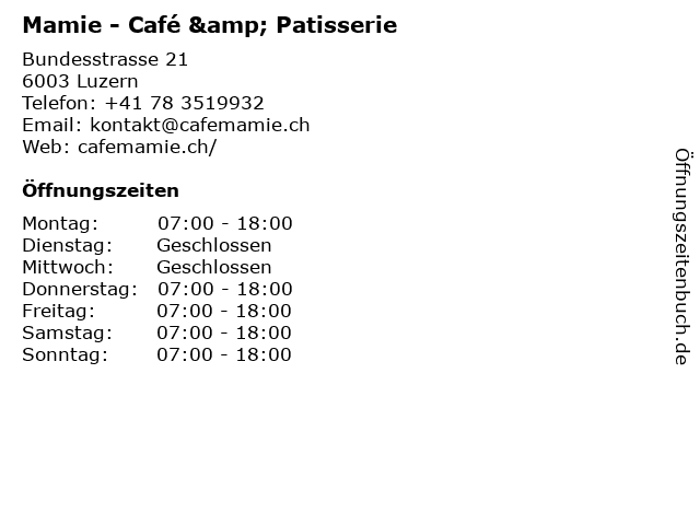 | Öffnungszeiten Mamie - Café & Patisserie in Luzern anzeigen | |
