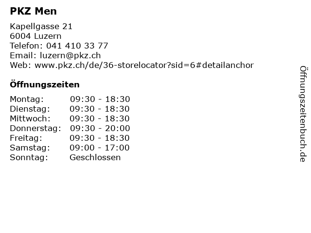 | Öffnungszeiten PKZ Men in Luzern anzeigen | |