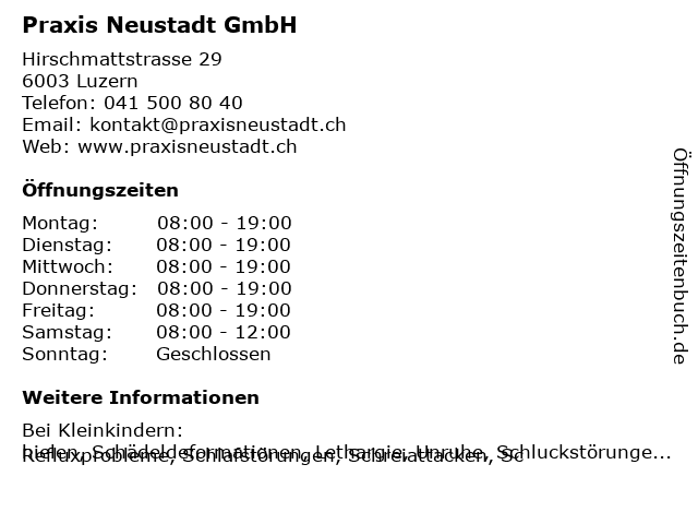 | Öffnungszeiten Praxis Neustadt GmbH in Luzern anzeigen | |