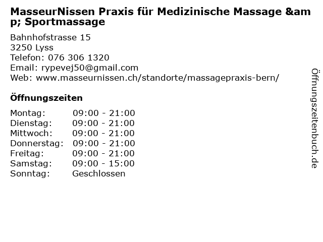 1 MasseurNissen Praxis für Medizinische Massage & Sportmassage (Entfernung: 16,94 km) Niesenweg 4, 3012 Bern 2 MasseurNissen Praxis für Medizinische Massage & Sportmassage (Entfernung: 17,68 km) Christoffelgasse 6, 3011 Bern 6 |