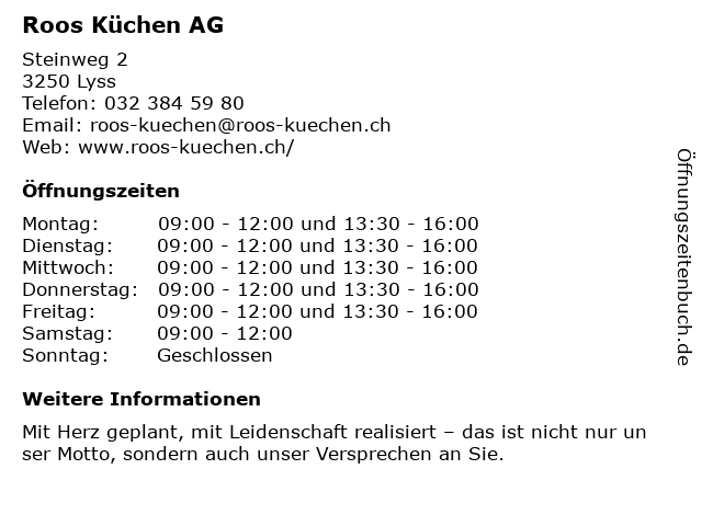 | Öffnungszeiten Roos Küchen AG in Lyss anzeigen | |