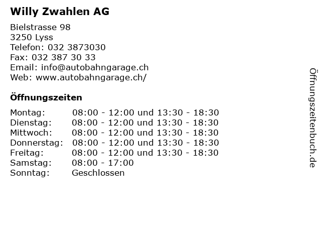 | Öffnungszeiten Willy Zwahlen AG in Lyss anzeigen | |