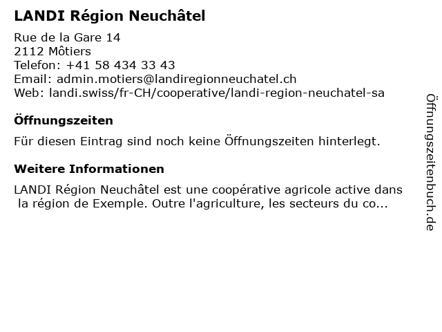 | Öffnungszeiten LANDI Région Neuchâtel in Môtiers anzeigen | |
