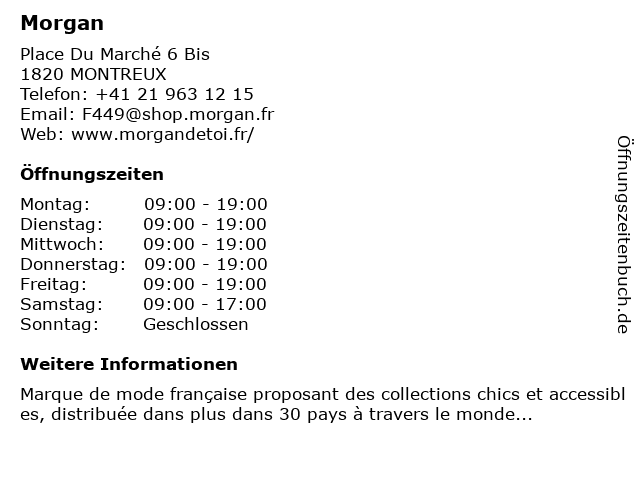 | Öffnungszeiten Morgan in MONTREUX anzeigen | |