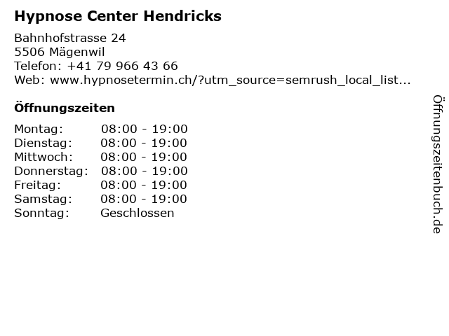 | Öffnungszeiten Hypnose Center Hendricks in Mägenwil anzeigen | |
