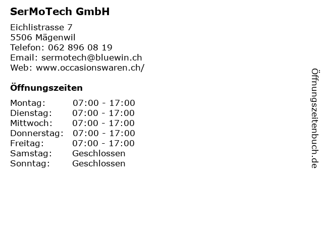 | Öffnungszeiten SerMoTech GmbH in Mägenwil anzeigen | |