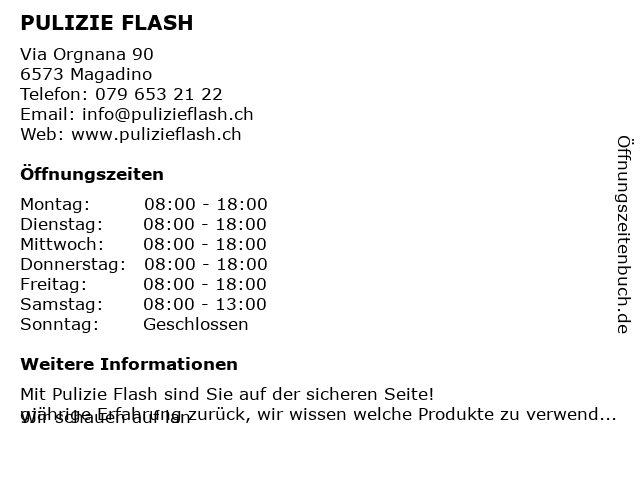 | Öffnungszeiten PULIZIE FLASH in Magadino anzeigen | |