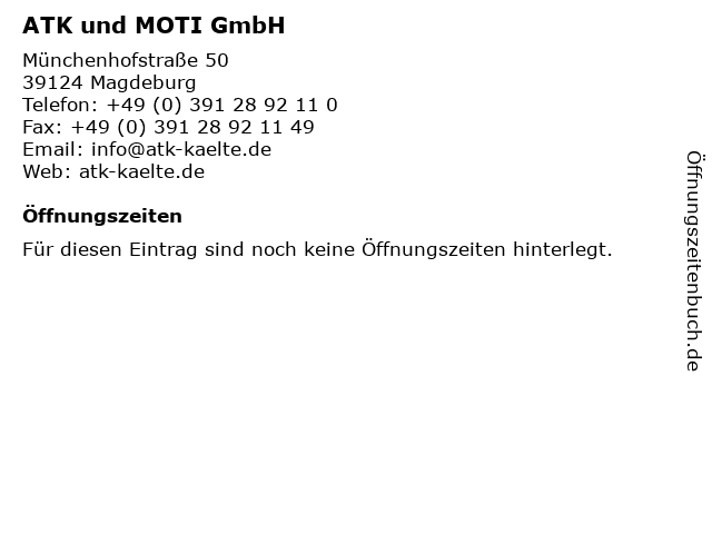 | Öffnungszeiten ATK und MOTI GmbH in Magdeburg anzeigen | |