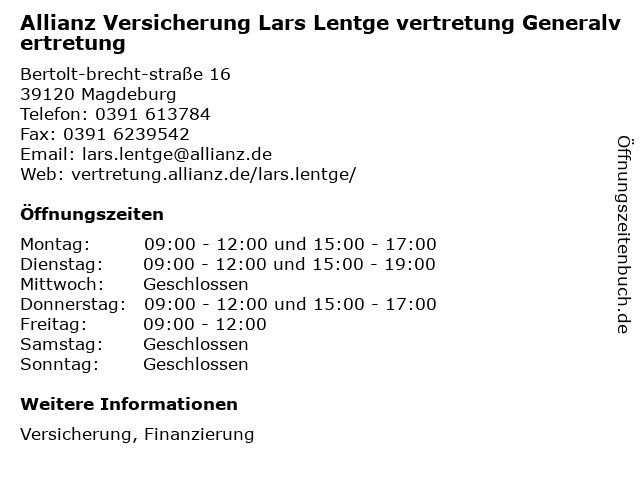 1 Allianz Versicherung Jens Schüler Generalvertretung (Entfernung: 1,21 km) Raiffeisenstraße 24, 39112 Magdeburg 2 AXA Versicherung - Generalvertretung Peter Bartoly (Entfernung: 2,27 km) Herbarthstr. 6, 39122 Magdeburg 4 Mecklenburgische Versicherungsgruppe - Bezirks-Generalvertretung Thomas Förster (Entfernung: 2,68 km) Leibnizstraße 44, 39104 Magdeburg 5 Allianz Versicherung -Generalvertretung Linda Schade (Entfernung: 3,54 km) Arndtstr. 55, 39108 Magdeburg 6 |