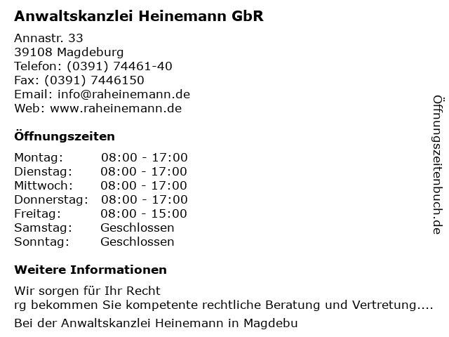 2 Sybille Heinemann e.K. Personal- und Managementberatung (Entfernung: 0,53 km) Toepfferspark 5, 39108 Magdeburg 3 Heinemann ö.b.v. Sachverst. f. Baugrunduntersuchungen (Entfernung: 1,04 km) Klausenerstr. 49, 39112 Magdeburg 5 Frau Silvia Heinemann (Nachfolge Frau Dr. Blümel) Schwerpunktpraxis für Gynäkologische Onkologie (Entfernung: 1,87 km) Leipziger Straße 17a, 39112 Magdeburg 6 Allianz Versicherung Steven Heinemann Generalvertretung (Entfernung: 2,33 km) Halberstädter straße 165, 39112 Magdeburg |