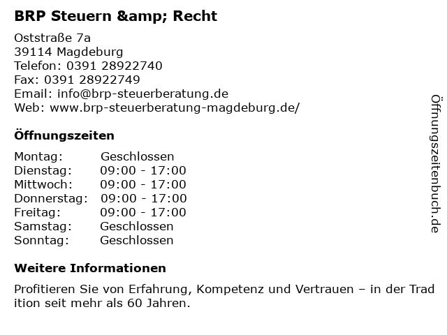 | Öffnungszeiten BRP Steuern & Recht in Magdeburg anzeigen | |