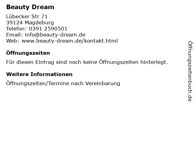 | Öffnungszeiten Beauty Dream in Magdeburg anzeigen | |