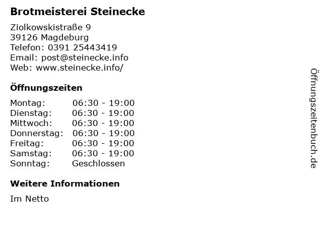 | Öffnungszeiten Brotmeisterei Steinecke in Magdeburg anzeigen | |