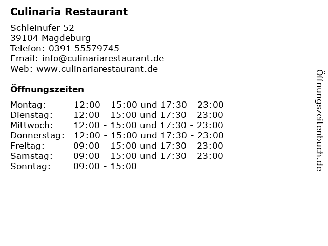 | Öffnungszeiten Culinaria Restaurant in Magdeburg anzeigen | |