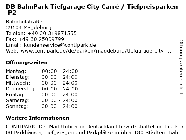 Branchen & Suchbegriffe zu DB BahnPark Tiefgarage City Carré / Tiefpreisparken P2:24/7, bahnpark, bequem, carré, city, dauerparken, db, günstig, p2, parken, parken city carré / tiefpreisparken p2, parken magdeburg, tiefgarage, tiefgarage magdeburg, tiefpreisparken, zentral |