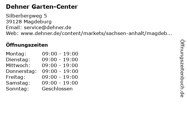 | Öffnungszeiten Dehner Garten-Center in Magdeburg anzeigen | |