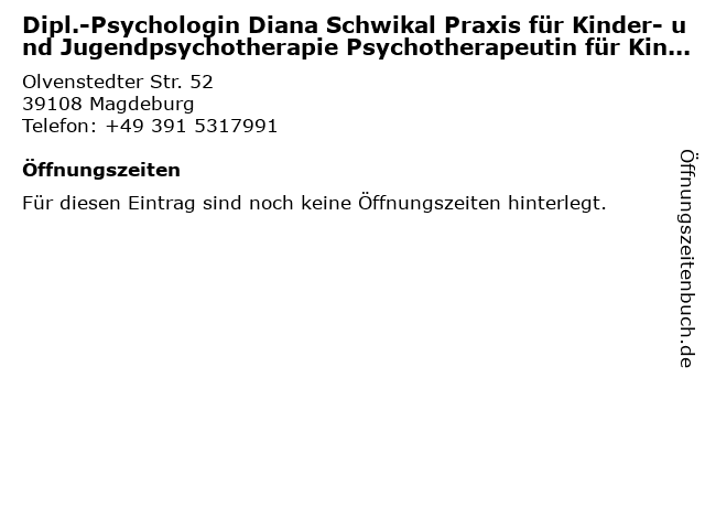 | Dipl.-Psychologin Diana Schwikal Praxis für Kinder- und Jugendpsychotherapie Psychotherapeutin für Kinder und Jugendliche anrufen | |