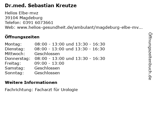 | Öffnungszeiten Dr.med. Sebastian Kreutze in Magdeburg anzeigen | |