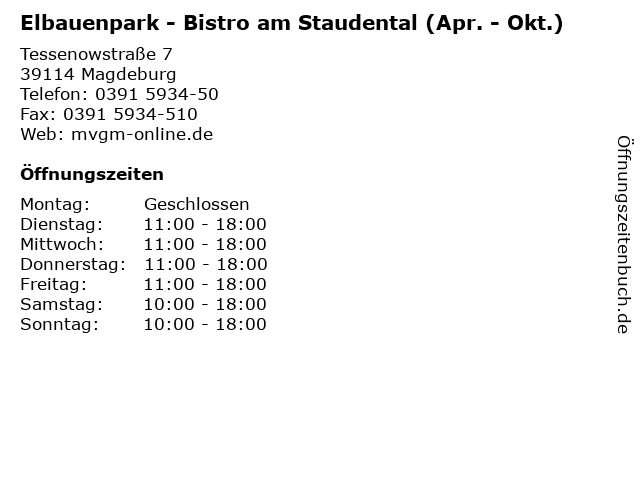 Branchen & Suchbegriffe zu Elbauenpark - Bistro am Staudental (Apr. - Okt.):apr., bistro, elbauenpark, erholung, freizeitpark, okt., staudental |