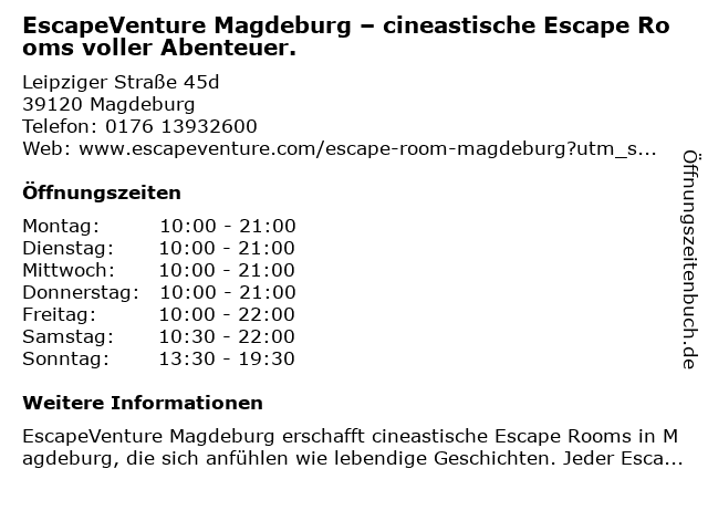 Branchen & Suchbegriffe zu EscapeVenture Magdeburg – cineastische Escape Rooms voller Abenteuer.:abenteuer., cineastische, escape, escapeventure, rooms, voller, – |