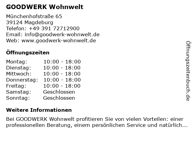| Öffnungszeiten GOODWERK Wohnwelt in Magdeburg anzeigen | |