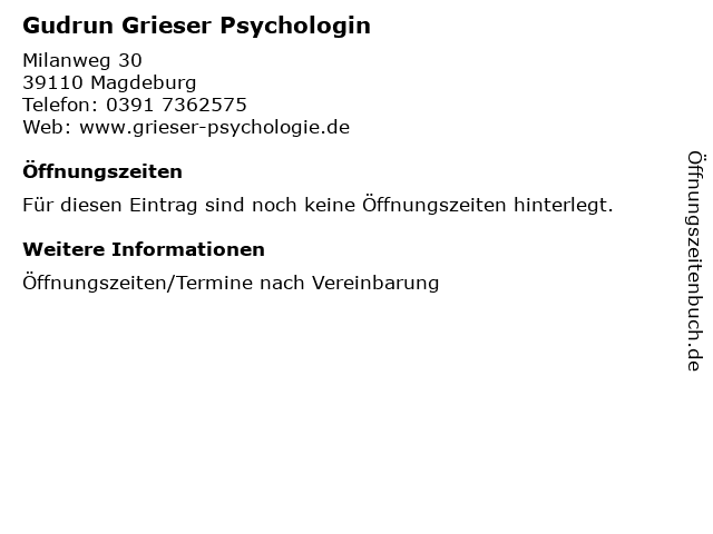 | Öffnungszeiten Gudrun Grieser Psychologin in Magdeburg anzeigen | |