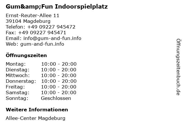 | Öffnungszeiten Gum&Fun Indoorspielplatz in Magdeburg anzeigen | |