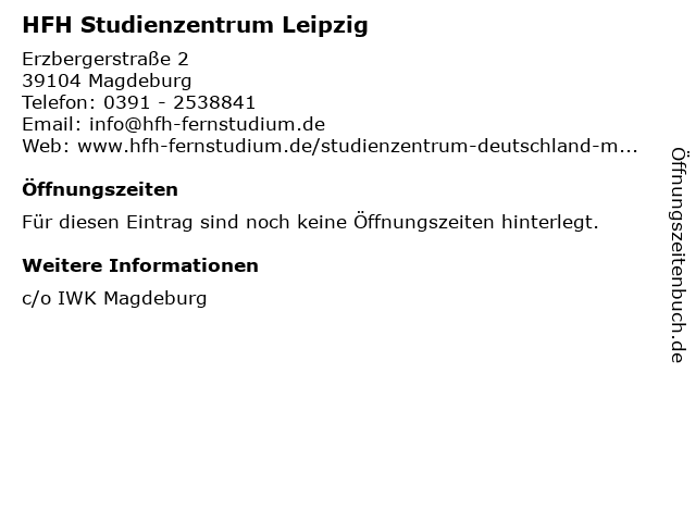 | Öffnungszeiten HFH Studienzentrum Leipzig in Magdeburg anzeigen | |