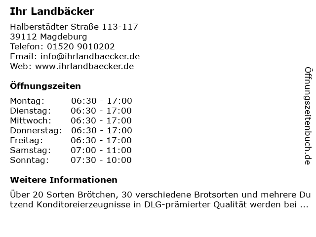 | Öffnungszeiten Ihr Landbäcker in Magdeburg anzeigen | |