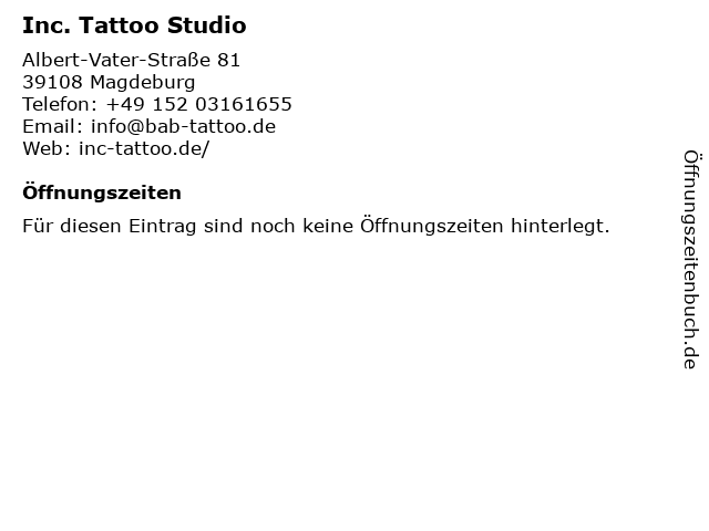 | Öffnungszeiten Inc. Tattoo Studio in Magdeburg anzeigen | |