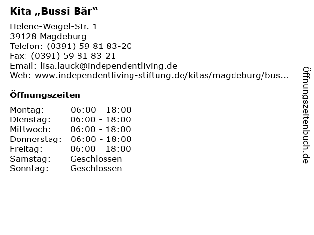 | Öffnungszeiten Kita „Bussi Bär“ in Magdeburg anzeigen | |
