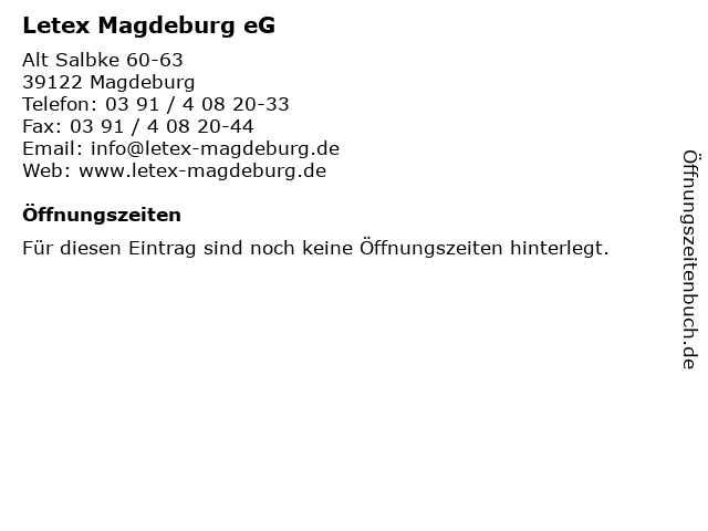 | Öffnungszeiten Letex Magdeburg eG in Magdeburg anzeigen | |