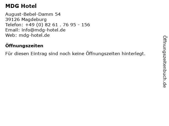 | Öffnungszeiten MDG Hotel in Magdeburg anzeigen | |