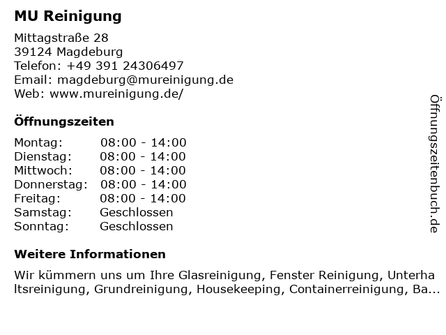 | Öffnungszeiten MU Reinigung in Magdeburg anzeigen | |