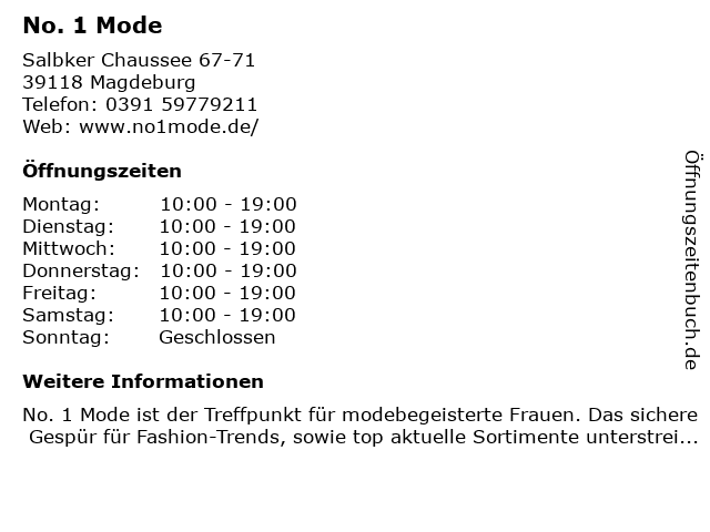 | Öffnungszeiten No. 1 Mode in Magdeburg anzeigen | |
