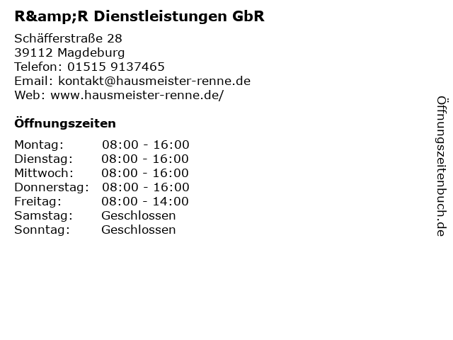 | Öffnungszeiten R&R Dienstleistungen GbR in Magdeburg anzeigen | |