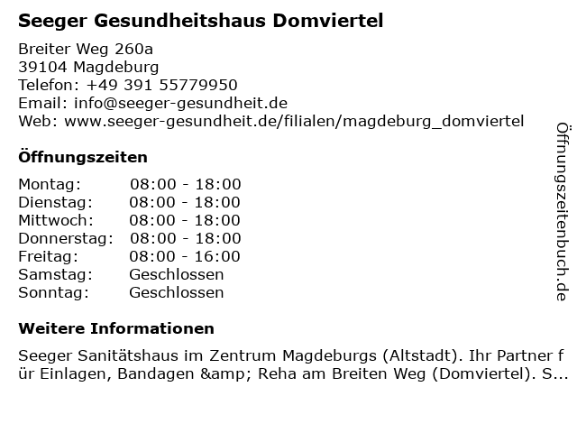 5 Seeger Gesundheitshaus Ottersleben (Entfernung: 4,71 km) Halberstädter Chaussee 123C, 39116 Magdeburg 6 |